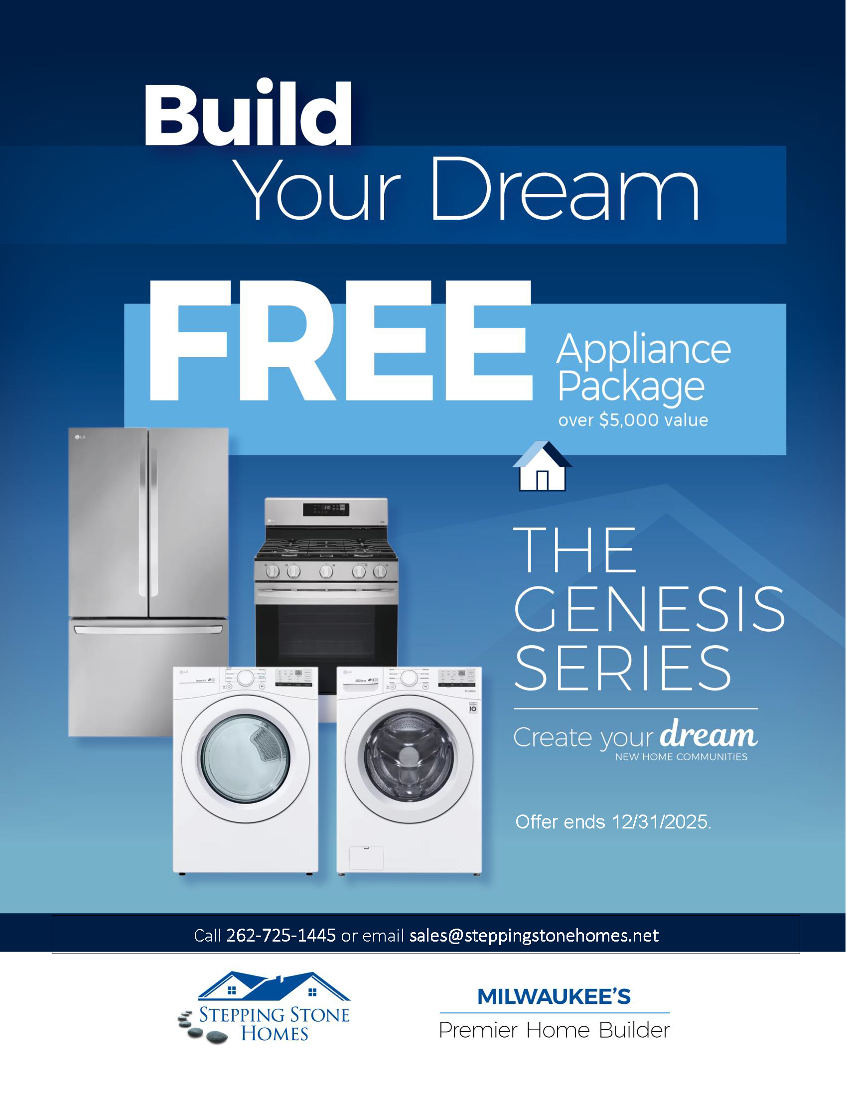 For a limited time, Stepping Stone Homes is making it even easier to move into your dream home. When you build a Genesis Series home, you’ll receive a free premium appliance package that includes a modern refrigerator, range, washer, and dryer. Everything you need to start living comfortably from day one.