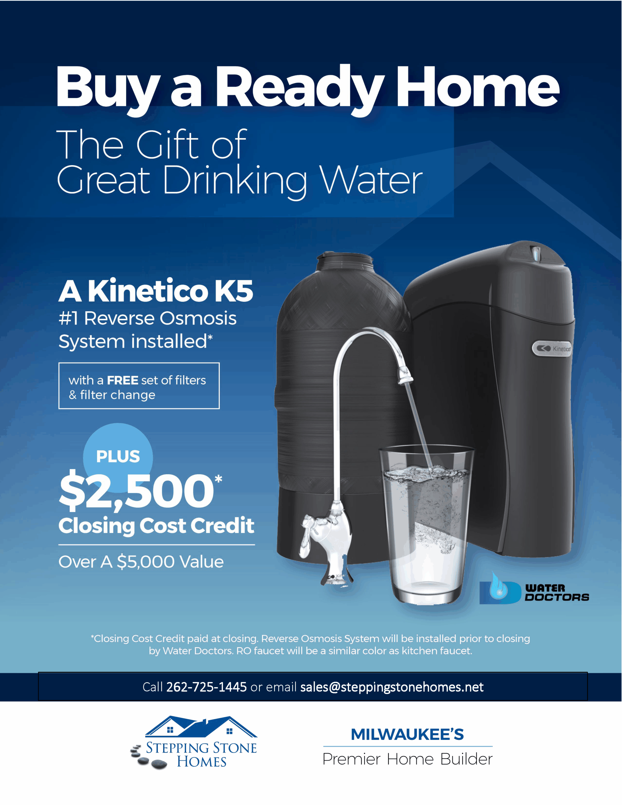 Move into a new Stepping Stone Homes Ready Home and enjoy clean, great-tasting water from day one. For a limited time, qualifying Ready Homes include a Kinetico K5 Reverse Osmosis System, professionally installed before closing, plus a generous closing cost credit.